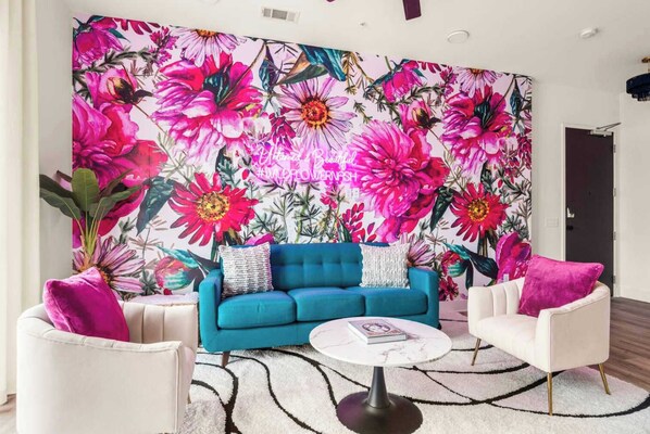 ▻ Living Room: Queen memory foam sofa sleeper, 55" Roku TV (guest mode), ceiling fan, cocktail table with 4 chairs, full-length mirror