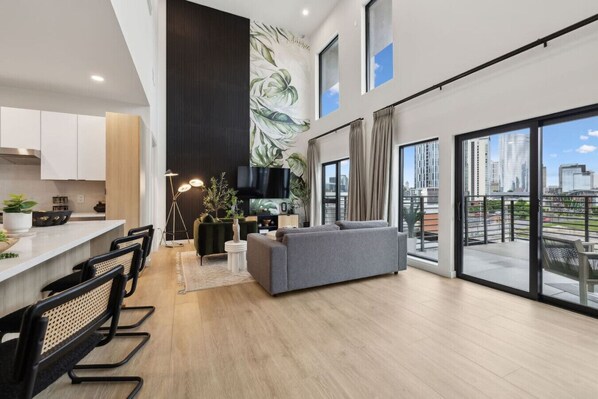 Newly built in 2023 and ideally located in walkable Downtown Nashville, Beverly Nash is perched upon the penthouse floor of The Hyve building. Our condo has stunning downtown skyline views with 20ft ceilings, providing the ultimate in luxurious living right in the very heart of Music City, as well as an on site gym, pool, free parking, and so much more. Walking distance (.7 miles) to World Famous Lower Broadway!
