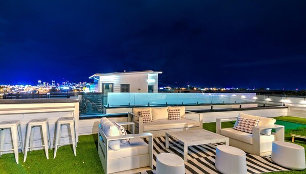 Savor the breathtaking city views from the private rooftop patio, featuring a hot tub and a 3-hole putting green perfect for unwinding or indulging in rooftop celebrations! Whether it's an intimate cocktail hour or basking in the sun, this chic space sets the stage for unforgettable memories!