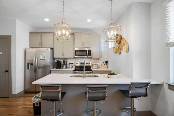 This gorgeous brand new build is complete with three bedrooms and three full bathrooms. The downstairs bedroom has a queen bed. The second floor has a living area with a pull out sofa, kitchen, a full bathroom and washer and dryer. There is also a dedicated workspace perfect for all of your needs. The third floor has two additional bedrooms, one with a queen bed and the other with a king bed, and both have en suite bathrooms.