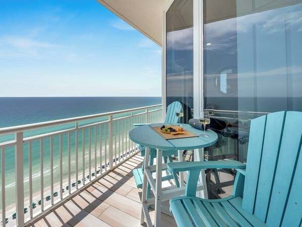 The living room is an entertainer's paradise with ample seating, a large smart TV, and a Bose Bluetooth speaker for enjoying music and movies. For an added touch of luxury, there's another wet bar with a Delta touch faucet, separate ice maker, and a Ninja blender for crafting frozen cocktails. Step out onto the South-facing private balcony, where you can soak in unobstructed views of the Gulf of Mexico. This expansive wrap-around balcony also offers sweeping vistas of the barrier island and stunning sunrises and sunsets, and is furnished with premium Polywood outdoor furniture perfect for lounging or enjoying the perfect evening. The balcony is the ultimate space to relax or entertain in style.