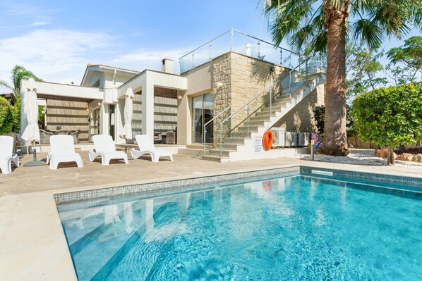 The larger 10m x 5m private pool is a perfect place to enjoy your holiday in Cyprus and features large walk-in steps for easy access along with optional pool heating *additonal charges apply Drone Tour