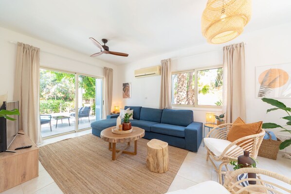 The living area is bright and airy; a perfect escape from the warm Cyprus sun. The spacious open-plan living area extends to the kitchen/dining room; ideal for families and larger parties.