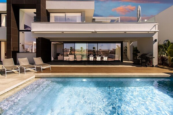 Direct access to a stunning terrace and pool area, offering plenty of lounging and seating space.