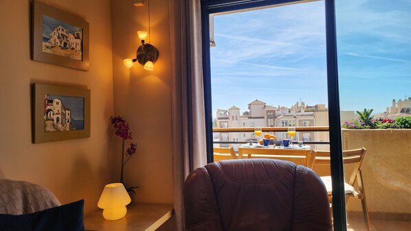 Accommodation is all on one level with lift access & comprises well-equipped fitted kitchen with ceramic hob, oven, microwave etc. The open plan lounge/dining room has sofas & dining furniture for 6 people. Flat screen TV with international channels. Sliding door access to the South facing balcony terrace & delightful views towards the sea. The spiral staircase to the private roof terrace is also located in the lounge.