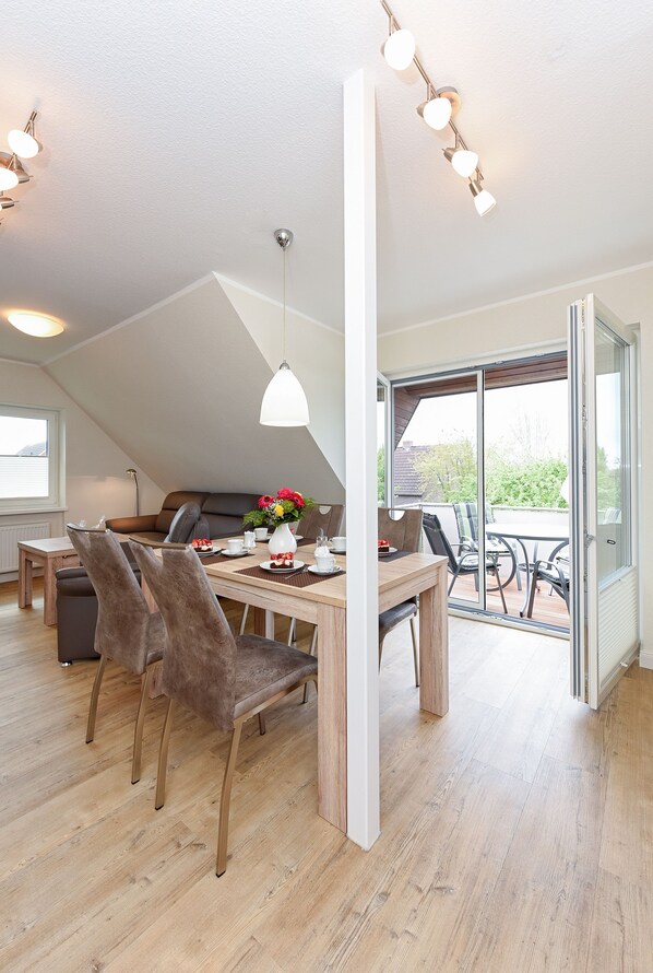 Größe ca. 60 Quadratmeter, Wohnraum mit integrierter Küche und Essgruppe, Schlafzimmer, zweites separates Schlafzimmer, Badezimmer mit Dusche, Waschtisch und WC, Obergeschoss, Balkon, optimal für 2 bis 4 Personen.