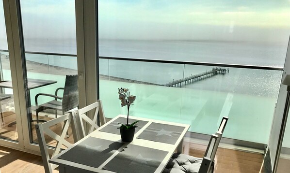 Das geschmackvoll eingerichtete, helle 2-Zimmer-Nichtraucherappartment bietet viel Sonne und einen fantastischen, frontalen Meerblick aus den bodentiefen Fenstern! Das Appartement ist mit hochwertigen Designplanken ausgelegt. Im kleinen Schlafzimmer blicken unsere Gäste vom Bett aus auf die Ostsee. Das Boxspringbett (1,80x 2 m) ist in eine gemütlichen Nische eingepasst, so dass es nicht von der Bettseite, sondern vom Fußende betreten werden muss. So braucht beim Aufstehen nicht über jemanden hinweg geklettert werden. Hier finden sich auch ein Kleiderschrank mit viel Stauraum. Im Wohnraum befindet sich ein großes Sofa, welches mit einem Handgriff in ein Französisches Bett (1,40 x 2 m) umgewandelt werden kann. Vom Sofa aus hat man einen tollen Blick auf den großen 55-Fernseher oder auf die Ostsee. Im Wohnraum befinden sich außerdem eine schöne weiße Essgruppe, 2 gemütliche Sessel am Fenster zum Lesen oder Träumen und eine kleine voll ausgestattete Küchenzeile mit 2 Herdplatten, Kühlschrank und hochwertiger Miele-Mikrowelle. Ein schönes neues Duschbad macht das Appartement komplett. Vom großen Süd-Balkon haben die Gäste einen atemberaubenden Blick über die Lübecker Bucht und den Strand. Falls unsere Gäste eigene Bettwäsche und Handtücher mitbringen möchten: bitte an passende Laken für die durchgehenden Matratzen denken (das Boxspringbett hat einen durchgehenden Topper). Gern können Sie gegen einen kleinen Aufpreis auch unser Wäschepaket nutzen, damit sie sich direkt in die frisch bezogenen Betten legen und unsere Handtürcher nutzen können. Das Wäschepaket beinhaltet 1x Bettwäsche und Laken, 1 Badetuch, 2 kleine Handtücher pro Person und 1 Duschvorleger. Geschirrtücher und Bademantel bringen Sie bitte mit.