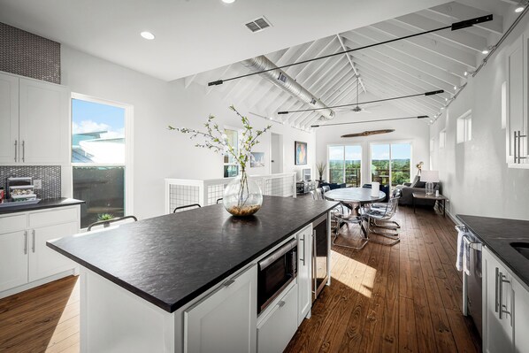 Flowing from the living area, the gourmet kitchen is equipped with a Viking range, stainless-steel appliances and a wide range of dining and cookware, as well as both bar seating and a full dining table and chairs. Coffee, spices and other essential items are provided.