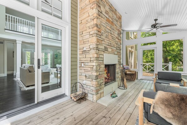 The main level opens into a soaring, sunlit great room centered around a dramatic stone fireplace and layered with plush seating and curated art. French doors lead to the screened porch, while the adjacent dining area flows seamlessly into a chef’s kitchen outfitted with SubZero refrigeration, a Viking range, two dishwashers, a wine fridge, and a generous walk-in pantry, perfect for entertaining in every season.