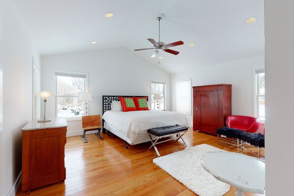 At night, the bedroom wing is just off the kitchen. There are two king bedrooms, one bedroom with a queen-size bed, and a spacious primary suite accessed from the living area with a king-size bed, a large walk-in closet, and a new and beautiful bathroom with a shower and tub. Please note that the primary bedroom, the second bedroom, and the bathrooms have wide doorways with no sills, designed to easily accommodate everyone.
