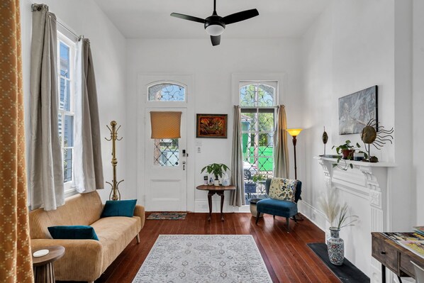 Built-in the late 1800s, this Double Shotgun is a spacious 2 bedroom home with high ceilings and hardwood floors. The bedroom is furnished with a queen-sized bed. The second room in the apartment has a queen futon that can accommodate two people. There is a door separating the two sleeping spaces but it is a classic shotgun apartment.
