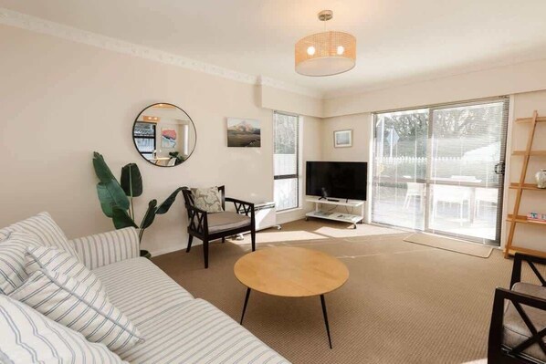 This thoughtfully decorated retreat creates a warm and inviting atmosphere, with sunshine streaming in to provide a cozy sanctuary after a day of adventure. The living area opens to a spacious deck, where you can unwind with a glass of wine while admiring the breathtaking Pōhutukawa-framed views of the sparkling blue water.