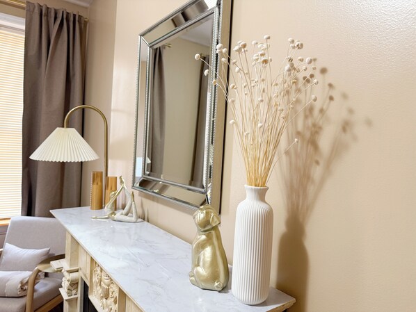 Enjoy two beautiful decorative fireplaces with candles, blackout curtains in every room, and large closets for easy storage.
