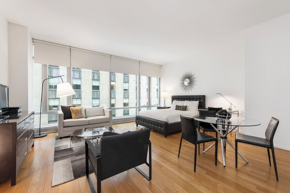 This contemporary studio apartment is situated in a high-rise building near Rockefeller Center, offering the perfect mix of Midtown excitement and Manhattan sophistication. The apartment features 14-foot ceilings and floor-to-ceiling windows, as well as hardwood floors, stainless steel appliances and an in-unit washer/dryer. All beds provided are fitted with plush linens and pillows. All Furnished Quarters apartments include 24/7 guest service.Pets are allowed in select apartments and are subject to a $500 non-refundable pet sanitation fee for one pet, $750 for two pets. Additional charges and size/breed restrictions may apply and vary by building. All pets must be approved by Furnished Quarters. Please let us know ahead of booking if you plan on traveling with a pet.