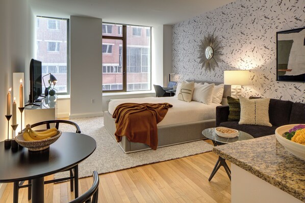 This modern studio in the Financial District features hardwood floors, granite countertops, stainless steel appliances and an in-unit washer/dryer. All beds provided are fitted with plush linen sheets and pillows. All Furnished Quarters apartments include 24/7 guest service.