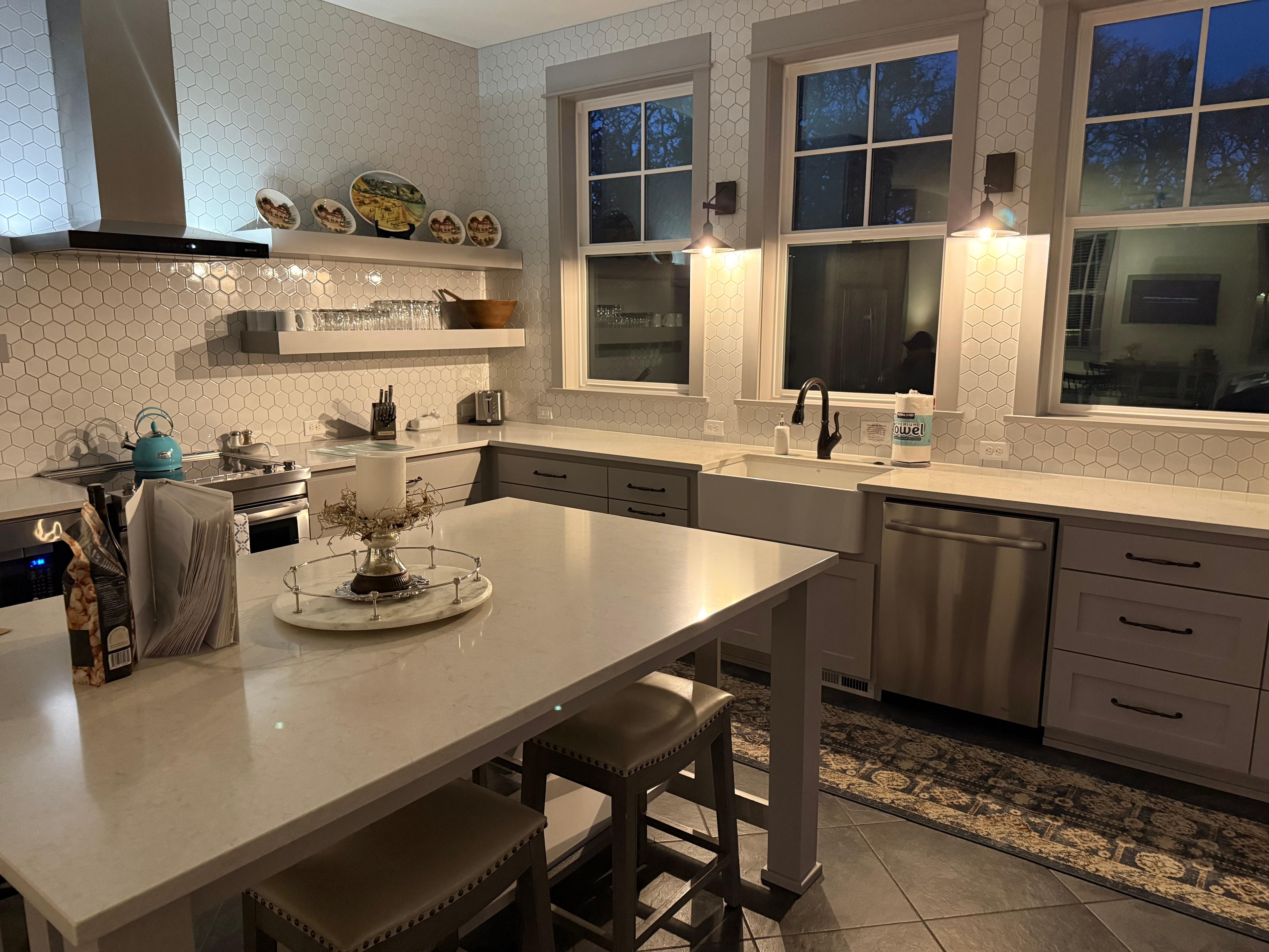 Die opulente Küche bietet schöne Quarz-Arbeitsplatten, brandneue Geräte und alles, was Sie für die Zubereitung Ihrer Weinlandküche benötigen. Die zentrale Insel bietet Platz für alle, die Spaß haben oder dem Küchenchef ein Meisterwerk zaubern möchten. Der angrenzende Essbereich bietet Platz für sechs Personen an einem wunderschönen antiken Tisch. Das geräumige Wohnzimmer verfügt über eine gemütliche Couch und einen großen Flachbild-TV mit DirecTV und einem Roku-Streaming-Gerät.