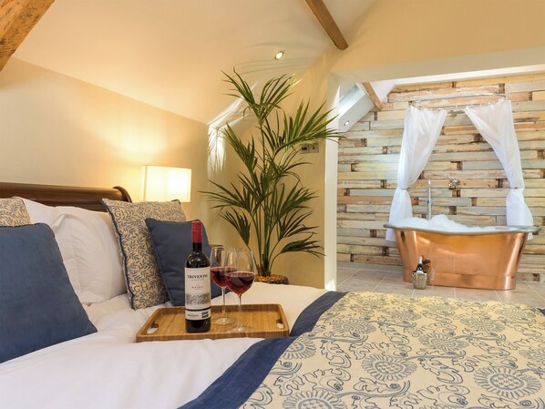 Schlafzimmer 1: Mit Kingsize-Bett, Freeview-TV, Velux-Fenster und eigenem Bad mit Duschkabine und WC.