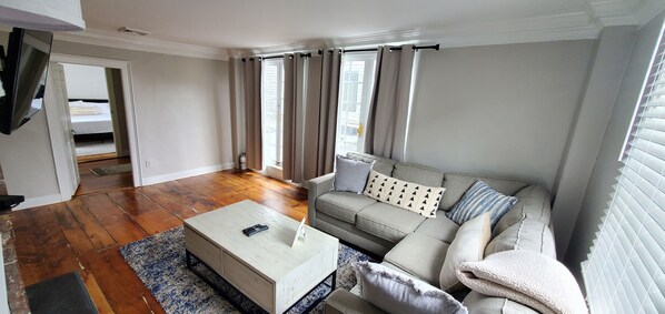 This gorgeous second floor, 2 level unit is nicely decorated and a great home base to stay while exploring historic Newport. This charming flat is only steps away from all of the Thames Street shops and restaurants. The TV in the living room is equipped is a smart TV with all your favorite apps to log into, a great connection to our speedy WIFI, and the kitchen has all the fixings for your morning cup of coffee.
