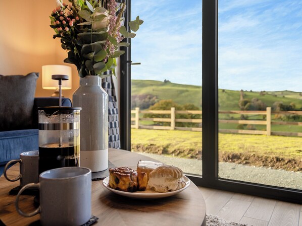 A Stylish Countryside Escape This spacious three-bedroom lodge sleeps up to six guests and offers an open-plan layout that’s perfect for relaxing, entertaining, or simply enjoying the views. At the heart of the lodge is a bright living space with floor-to-ceiling patio doors that open directly onto a patio – bringing the outside in. Snuggle up on the corner sofa in front of the log burner, stream your favourites on the Smart TV, or share meals around the modern dining table. The fully equipped kitchen is finished to a high standard, with everything you need for a comfortable self-catering stay. Underfloor heating runs throughout the property, making it feel cosy all year round.