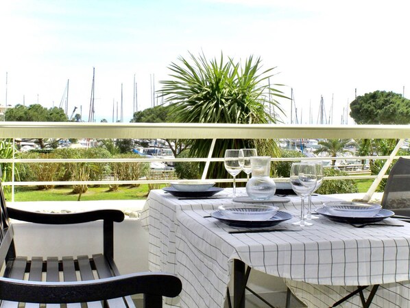 Das Beste an dieser Unterkunft: Zeitgenössisches Apartment in neuwertigem Zustand mit Terrasse, die einen schönen Blick auf den Hafen von Marina Baie des Anges und seinen Garten bietet.