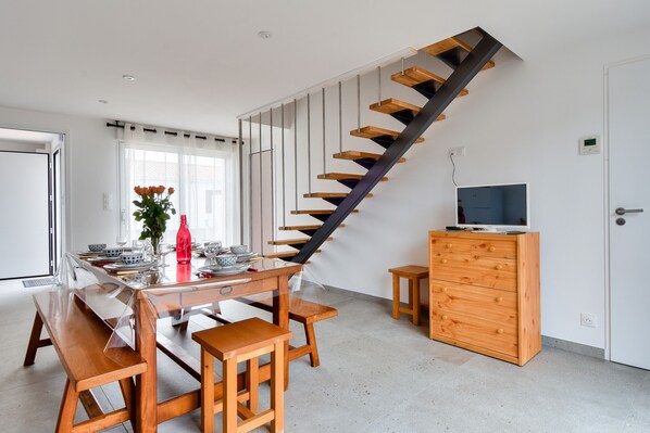 Der Wohnbereich befindet sich im Erdgeschoss und ist ein offener Raum. Der Esstisch lädt zum Teilen guter Mahlzeiten und geselliger Momente ein. Anschließend finden Sie eine sehr gut ausgestattete Küche (Induktionsherde, Kühlschrank, Mikrowelle, Backofen, Gefrierschrank, Geschirrspüler, Kaffeemaschine, Toaster und Wasserkocher), um Ihre Spezialitäten zuzubereiten. Dann gibt es einen Loungebereich mit Sofa für einen Moment der Entspannung vor dem Fernseher.