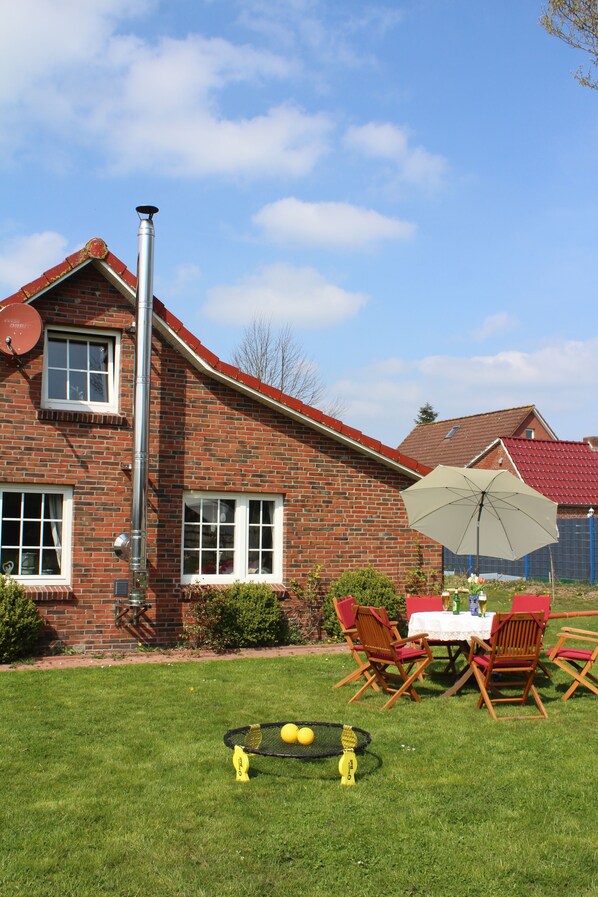 Vom Wohnzimmer und von der außen am Haus entlang verlaufenden großen Terrasse aus haben Sie einen wunderschönen Blick in den 1800qm großen naturbelassenen Garten. Das Besondere an dem Garten ist die vielfältige Abwechslung. Neben Blumenbeten umfasst der Garten ein Gartenhaus und eine große Rasenfläche. Die Rasenfläche bietet viel Platz zum Spielen und kann als Liegewiese genutzt werden. Holzstühle und ein Tisch befinden sich in dem großen Gartenhaus, die gerne frei nach Bedarf genutzt werden dürfen. Auch auf der überdachten Terrasse sind Sitzmöglichkeiten. Für die Kinder sind eine Rutsche, Sandkasten, Schaukel, Nestschaukel, Trampolin, ein Rebounder, sowie ein Federballnetz mit Schlägern vorhanden! Das Federballnetz befindet sich im Gartenhaus. Ebenfalls dort steht ein Grill, den Sie gerne benutzen dürfen. Westlich des gesamten Gartens schließt sich eine typische ostfriesische Weidelandschaft an. Auf der können Sie Schafe bewundern und den wunderschönen Sonnenuntergang von der Terrasse aus genießen. Der Blick in diese wunderschöne Landschaft ist unverbaut.