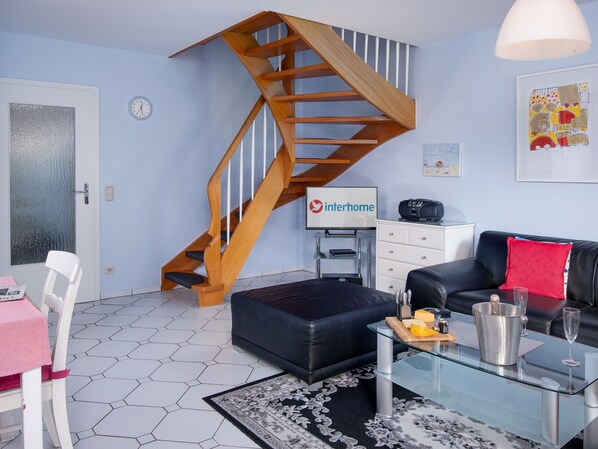 "Krebs", 3-Zimmer-Reihenhaus 82 m2 auf 2 Stockwerken. Gemütlich eingerichtet: Wohn-/Esszimmer mit Kabel-TV (Flachbildschirm), Radio und CD. Ausgang zur Terrasse. Küche (Backofen, Geschirrspüler, 4 Glaskeramikplatten, Toaster, Wasserkocher, Mikrowelle, elektrische Kaffeemaschine). Dusche/WC. Obergeschoss: 1 abgeschrägtes Zimmer mit 1 Doppelbett (2 x 90 cm, Länge 200 cm). 1 abgeschrägtes Zimmer mit 2 Betten (90 cm, Länge 200 cm), Bad/WC. Terrasse. Terrassenmöbel, Gartengrill. Zur Verfügung: Waschmaschine, Wäschetrockner, Kinderhochstuhl (extra). Internet (WLAN, gratis). Bitte beachten: Nichtraucher-Haus. Rauchmelder.