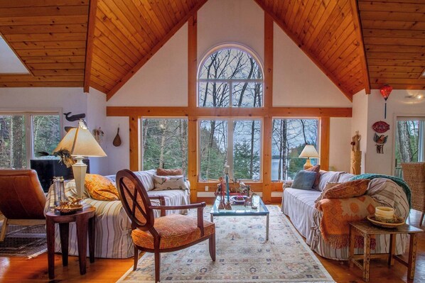 Sleeps 8 (plus children under 2) Non-shedding, hypoallergenic dogs only may be accepted by special approval only (sorry no cats or other pets due to allergies) Linens are not provided – please bring your own Heat pump provides heating and cooling Unlimited WiFi Fully equipped kitchen with dishwasher, washer (no dryer) 1 TV with Netflix access (using your own account), for streaming only (there is no channel reception). Standard DVD player and a selection of DVDs. Sound system BBQ, fire pit (limited supply of firewood is provided) 1 3-person canoe, 1 fishing kayak, 1 2 person (and 2 children) pedal boat Dock is not removed for the winter, marinas and public boat launches on the lake) 1 pair snowshoes, 1 set cross-country skis Automatic generator Limited garbage and recycling pickup is available, but disposal is required prior to departure 4WD and snow tires are essential for winter access Due to the location amid a hardwood forest, no smoking of any kind is permitted anywhere on the property