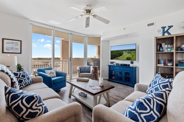 As you walk into the condo, you will notice the beautiful touches throughout. The kitchen is very spacious and has everything you need to cook your favorite meals. It overlooks the dining and living areas so it is perfect for gatherings. There is plenty of seating in the dining room for everyone. The living area is comfortable and inviting. There is a large Flat Screen TV in the living room to enjoy a movie or your sports team. There is a great outdoor patio to enjoy right off the living room.