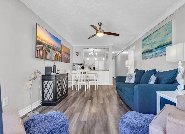 Step into a bright and airy living area designed for comfort. With plush seating, a flat-screen TV, and access to a private screened porch, this space is perfect for unwinding after a day of exploring. The queen-size pull-out couch provides additional sleeping space, making it ideal for larger groups. Enjoy breathtaking ocean views right from your living room!