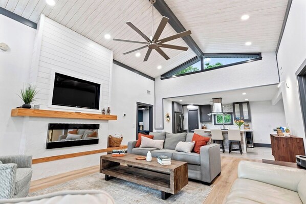 Stunning living room with soaring ceilings and large Smart TV