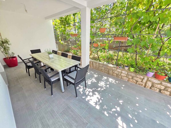 Lage Novi Vinodolski, Ortsteil Kalvarija. Die Ferienwohnung befindet sich auf einem 600 qm großen, geschlossenen Gartengrundstück mit Blumen, Sträuchern und Bäumen, von einem Zaun und einer Hecke begrenzt. Der Vermieter wohnt ständig im Haus. Apartman u prizemlju. Die Zufahrt erfolgt über eine Nebenstraße (asphaltiert). Parkplatz (für 2 Pkws) auf dem Grundstück und der Straße vor dem Haus.