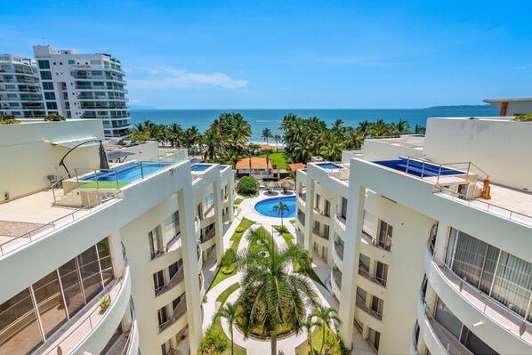 Bright coastal apartment with pool, balcony & beach access close by