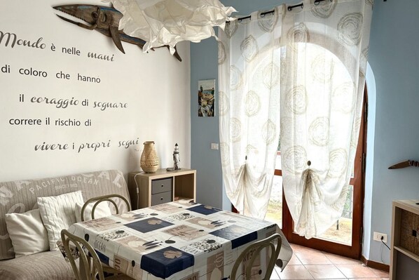 Description: two-room apartment on the first floor. Entrance, living area with sofa, table and access to the terrace - kitchen with washing machine - bedroom with double bed and two single beds (one of which is extractable) - bathroom with shower. The property includes a solarium equipped with table, chairs and sun loungers, with a beautiful sea view. Free parking on the street. Pets are not allowed.