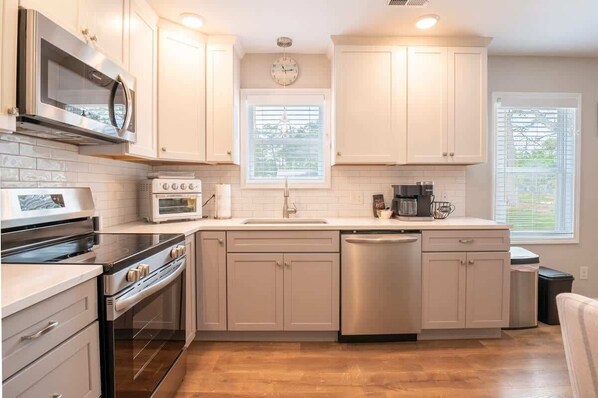 Kitchen- Fully stocked for cooking at home in an open space with a dining table