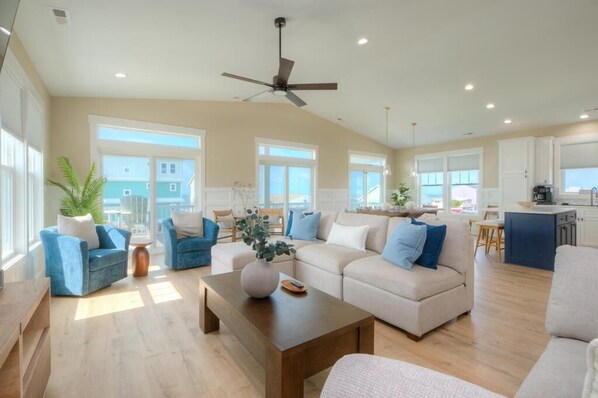 Inside this breathtaking home, you will find beach life to be easy and carefree with an open, reverse floor plan for the main living, dining and kitchen located on the top level to maximize the Atlantic Ocean views, as you gather with your loved ones making cherished memories. One primary king bedroom with private bath is also on this top floor. The bottom floor offers the remaining 4 bedrooms for your restful night's sleep and private oasis during the day if so desired. A second living area with queen sleeper sofa also beckons you to get comfortable, so there is plenty of space for everyone. For Your Convenience, a 2nd full-size refrigerator is in the ground level storage area.
