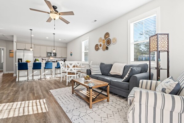 This newly constructed home, built in 2023, features an open-concept layout with a spacious living room filled with natural light, cozy modern decor, and comfortable seating. Enjoy the large smart TV, with games provided in the TV stand for extra entertainment. The adjacent kitchen boasts brand-new stainless steel appliances and is fully stocked, perfect for preparing delicious family meals. Gather around the quaint, expandable dining table that seats up to 6 for a cozy dining experience.