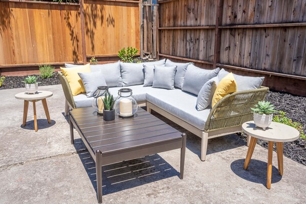 Unwind on your own outdoor patio and enjoy the serene ambiance. This charming space comfortably accommodates 4 guests.