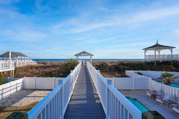 Positives #1: The kitchen and living room have a beautiful view of the ocean. When it's sunny, the home gets a lot of very nice light. #2: The private walkway to the beach (which includes a gazebo and a few well placed reading benches) is wonderful, and the deck area is spacious and comfortable for outside dinner/morning coffee...etc... #3: If you are traveling with dogs (our group had 2), the fenced backyard area is a really great space for them to frolic. Negatives #1: The downstairs ("ground floor") bedrooms are not attached to the main floor! If you're staying on the ground floor, then, you have to get upstairs by walking up the back deck or walking through the car port and up the front porch. This is not ideal under any circumstances, but definitely not when it's raining (as it did a few days this week). #2: The so-called ground floor bedrooms are also connected to each other in a really unusual way. In order to get outside, the people in the two twin beds have to walk through the room with the king bed. Unless a family is sharing these two rooms, this will make for some uncomfortable closeness. (My group of friends changed our rooming plans so that no one had to stay in the ground floor twin bedroom.) #3: To be blunt, this home could use some maintenance. On the main floor, the door to the bathroom jams very easily, meaning that it often needs to be yanked hard in order to get it open. (This isn't the only door with issues, by the way. The front storm door is also squeaky and slightly broken.) On the deck, there are a lot of nails that have popped up a bit and can easily be tripped over. #4: If you're traveling in a big group (but looking for peace and quiet), I would not recommend this home because the walls are pretty thin and it's very easy to hear everything going on in the kitchen from any of the main floor bedrooms. On that note, one of the main floor bedrooms is super close to both the front door and the oven. In spite of these concerns, which I am sharing in detail so that future renters have a more realistic sense of this property than what I perceived on the VRBO listing, my group (of 10) had an amazing time!