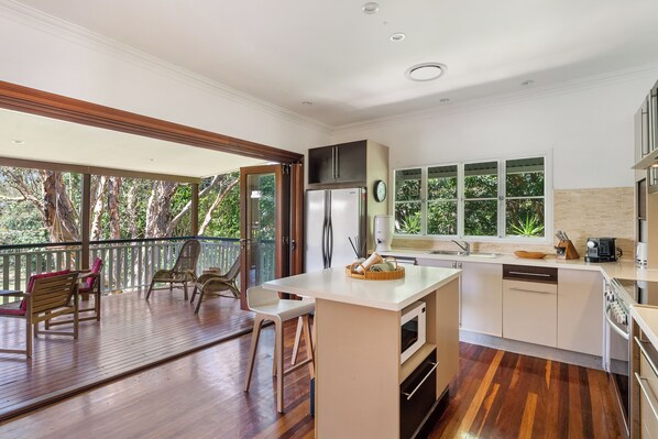 Where Ocean Breeze Meets Lagoon Serenity Welcome to a beautifully restored Queenslander, perched between the soothing sounds of the Pacific Ocean and the peaceful charm of a natural lagoon and nature reserve. Thoughtfully designed to capture cooling breezes and sweeping views through a long, lush garden, this home offers a truly tranquil escape. Enjoy private river access, perfect for sunset watching or stargazing under the open sky. The home blends timeless elegance with modern comforts, featuring Cambodian artifacts, smart technology, and zoned air conditioning throughout. Just minutes from your local beach, you ’ll also have access to top-of-the-line electric bikes to explore the area in style. Inside, the atmosphere is romantic and serene, with light-filled spaces and a gentle breeze that flows through the elevated position of the home. Unwind in the wellness room, complete with a massage bed, yoga mat, back stretcher, and more. Stream your favorite shows on the Smart TV, or simply relax with a complimentary bottle of wine waiting in the fridge. As a special touch, each guest receives a gift basket of artisan Cambodian goodies, placed at the end of each bed—yours to keep. This is more than a stay—it’s an experience designed to soothe, inspire, and reconnect you with nature and beauty.