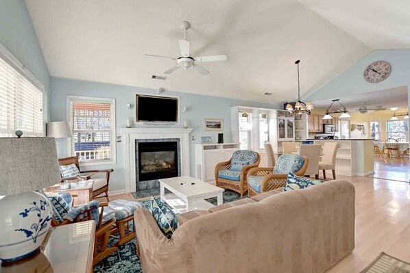 The living room is designed for comfort, ideal for gathering and relaxing after a day at the beach. A fully stocked kitchen and dining area are perfect for shared meals and laughter. Step onto the screened-in porch, just off the kitchen, for a tranquil outdoor experience. Additionally, a small deck and walkway behind the home, surrounded by trees, provide the perfect spot for enjoying the natural beauty and privacy.