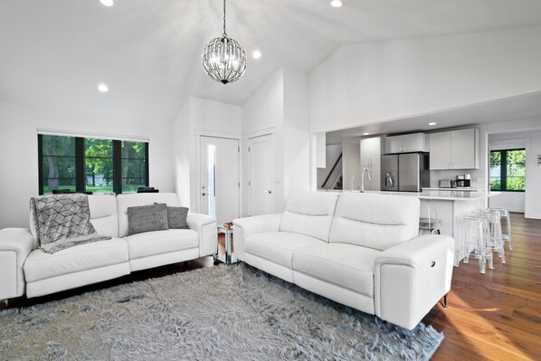 The newly renovated kitchen has all new appliances including a 6-burner gas stove, large air fryer/pizza oven, reverse osmosis drinking water, beverage cooler, quartz counters and hardwood floors. The large island seats 8 people; there is also a dining table that seats 4 and a pub table that seats 2.