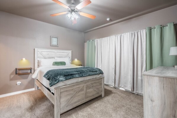 The downstairs master bedroom includes a queen bed and private full bathroom. Upstairs are two private bedrooms with queen beds and a second full bathroom, comfortably sleeping up to six guests.