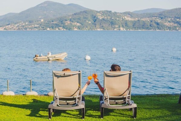 Der Privatstrand bietet mit seiner grosszügigen Liegefläche den idealen Ort für entspannte Stunden am Wasser. Für den Komfort ist der Strand vollständig mit Sonnenliegen, Sonnenschirmen, Aussenduschen sowie Toiletten ausgestattet Eine schattige Terrasse mit Bar lädt dazu ein, sich bei einem kühlen Getränk zu erfrischen und die Aussicht zu geniessen.