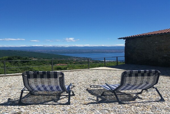 Liebevoll renoviertes Steinhaus aus dem 19. Jahrhundert mit herrlichem Blick auf Lovran und das Meer im kleinen Dorf Dobrec. Das Haus liegt oberhalb von Lovran am Hang des Učka-Gebirges und ist ideal für alle, die Ruhe und Entspannung suchen. Vom Eingang im Erdgeschoss gelangt man in den offenen Wohn- und Essbereich mit angrenzendem Flur und Badezimmer. Eine Treppe führt ins Untergeschoss mit zwei weiteren Schlafzimmern, von denen eines Zugang zur Terrasse bietet. Draußen lädt eine weitere Terrasse mit Liegestühlen, Sonnenschirmen und Grillmöglichkeiten zum Verweilen ein. Das Stadtbild von Lovran ist geprägt von wunderschönen Jugendstilvillen und herrlichen Parks mit exotischen Pflanzen. Hier gibt es zahlreiche Bademöglichkeiten, insbesondere entlang der 12 km langen Küstenpromenade.