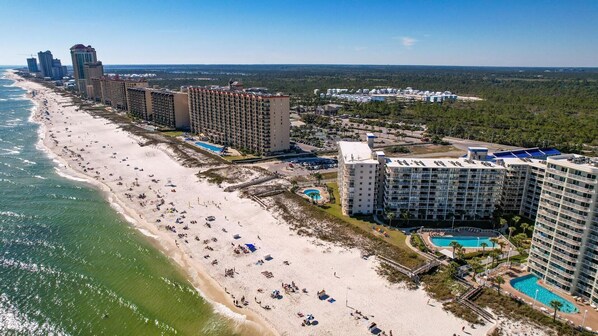 Beyond the captivating white sandy beaches and the welcoming Gulf waters, Seaside Beach & Racquet presents an array of amenities, including 2 outdoor pools, a heated indoor pool, 2 boardwalks, sand volleyball, a tennis court, shuffleboard, a sauna, and fitness center. Guests also enjoy access to outdoor grills and picnic tables.
