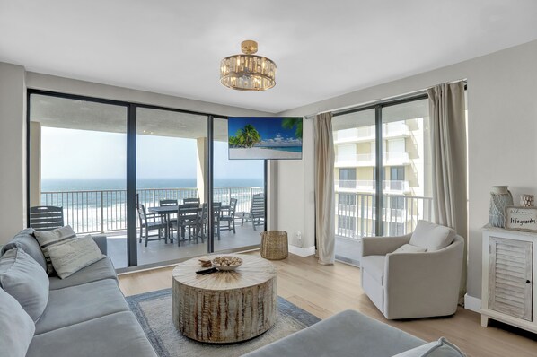 This stunning condo comfortably sleeps 8 and features all-new furniture, updated kitchen cabinetry and counters, fresh paint, and modern flooring. The spacious balcony provides the perfect spot to relax and take in the sights and sounds of the Gulf of Mexico.
