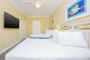 The living room must have been newly decorated, it was nice and the furniture was new. (The pull out couch needs a board put in the top or the cushions are going to be ruined because they fall down in the frame when sitting.)The beds were very comfortable. The bathrooms were clean and new. The patio furniture was nice and plentiful. The kitchen was well stocked with everything you need, including a good blender which was great. The pools were good and the beach access really nice with hoses for washing sand off every few feet up the walkway. It was great stay!