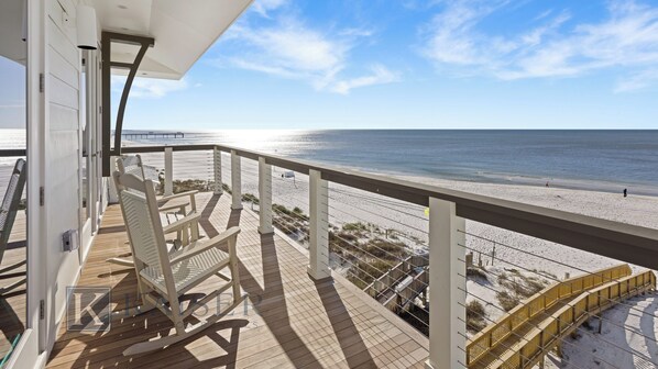 When you arrive at Emerald Bluff, you will find space to park up to 5 vehicles, entry to the home on either side of the carport, and access to the private pool and boardwalk to the beach. Upon entry to the main floor of Emerald Bluff, guests are greeted by an open-concept kitchen, living room, dining room, and wet bar. The virtual wall of windows, paired with the sweeping 10' ceilings, seems to bring the gulf inside to you. You will also find a powder room, laundry room, and sleeper sofa on this floor. Upstairs, guests will find 2 gulf-facing king bedrooms and 2 north-facing bedrooms featuring a queen bed and a double loft, each with a private bathroom. The top floor includes the main king suite and a private office. Beyond the family-friendly floor plan, this Orange Beach vacation home offers comfortable indoor and outdoor seating for every guest, plus generous flat-screen TVs in the main living area and every bedroom.