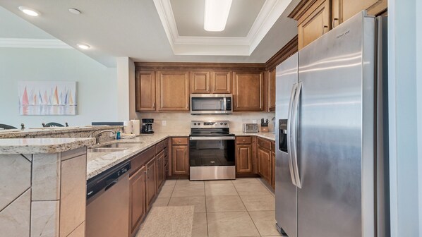 Beautiful condo with outstanding view of the Gulf, beach and lazy river pool from the wonderful and large private balcony. Living area and kitchen were very nice. Bedrooms and bathrooms were just ok, bathroom rugs in master looked dirty and a few white bath & hand towels looked stained. Potholders were not clean either. Parking on 4th floor ramp was great. Appreciated the shopping carts for unloading & reloading. Access to beach was convenient.
